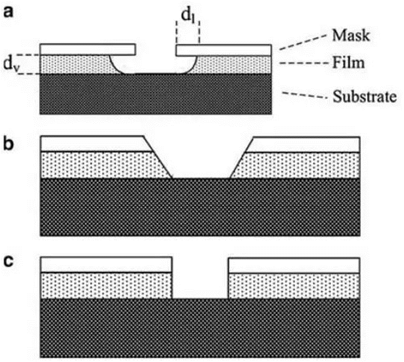 注:濕法刻蝕引起側蝕,使得刻蝕不能精確控制尺寸,而干法刻蝕(等離子刻蝕)則可以選擇性刻蝕。刻蝕類型有三種,分別是各向同性刻蝕(圖2a)、斜向刻蝕(圖2b)和垂直刻蝕/各向異性刻蝕(圖2c). (a). 各向同性刻蝕