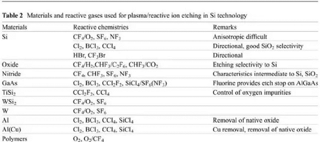 表2:等離子刻蝕中不同材料所用到的反應氣體