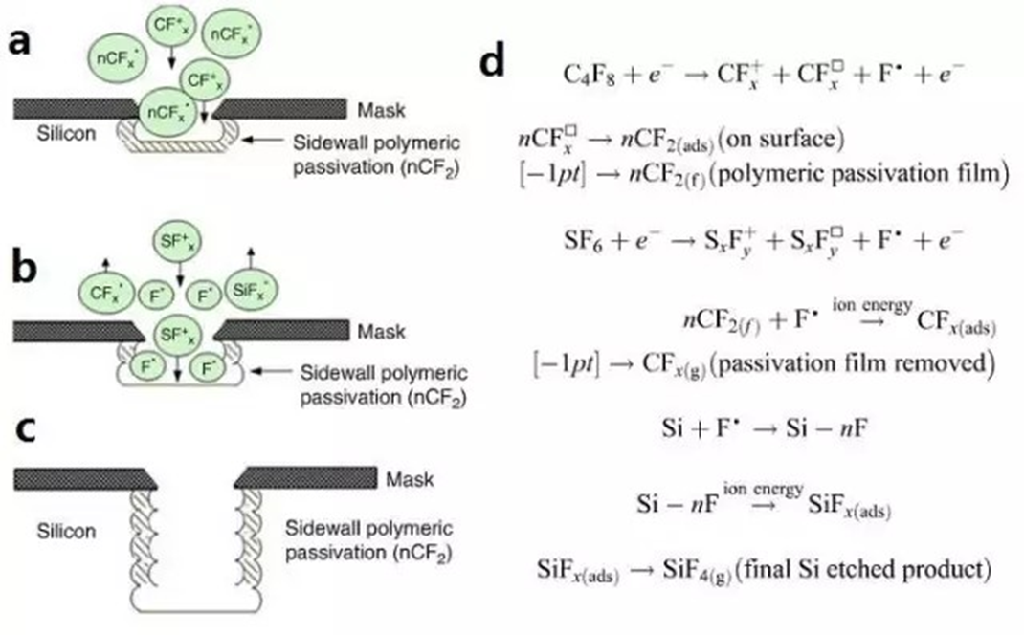 (c).經歷四次循環刻蝕后的輪廓;(d).參與反應過程的詳細化學方程式。