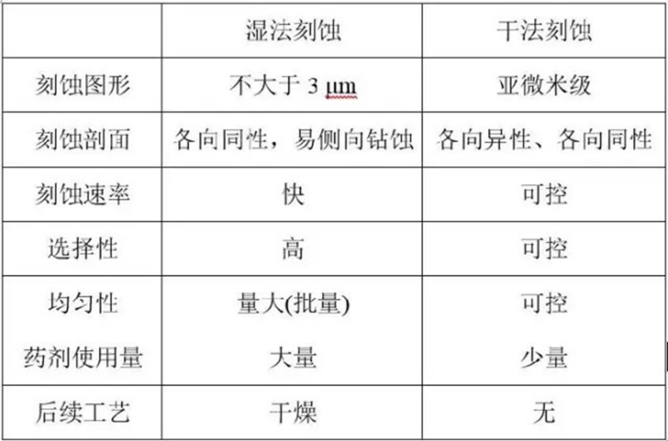 表1:濕法刻蝕和干法刻蝕性能對比